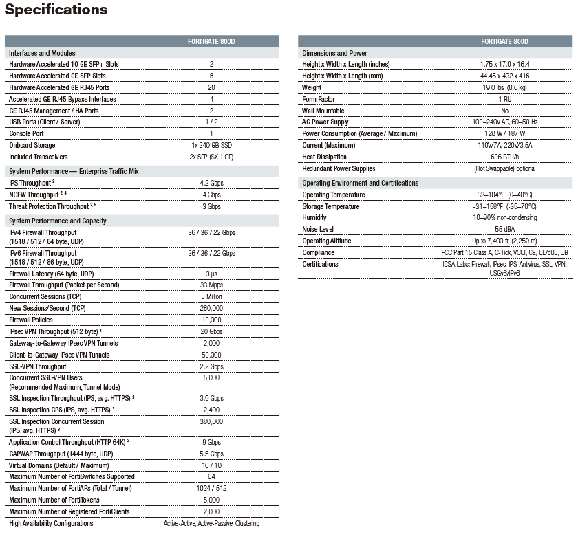 The FortiGate 800D delivers next generation firewall capabilities for mid-sized to large enterprises, with the flexibility to be deployed at the campus or enterprise branch. Protect against cyber threats with security processor powered high performance, security efficacy and deep visibility.