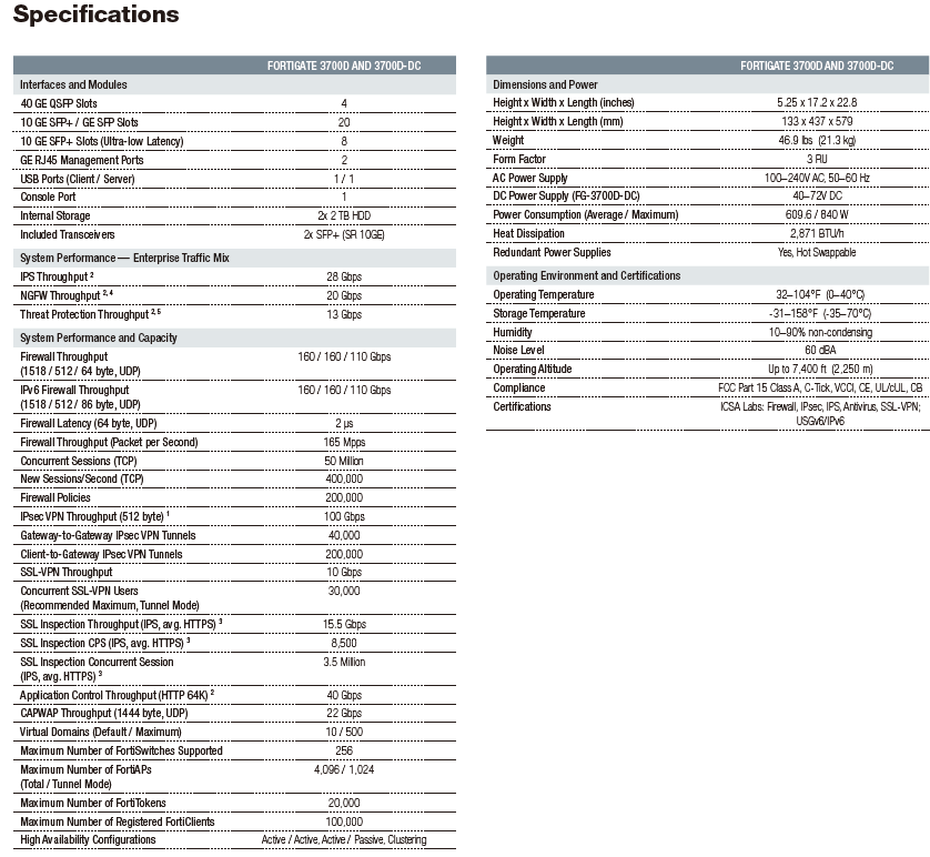 The FortiGate 3700D series delivers high performance threat protection and SSL inspection for large enterprises and service providers, with the flexibility to be deployed at the enterprise/cloud edge, in the data center core or internal segments. The multiple high-speed interfaces, high port density, superior security efficacy and high throughput of the 3700D series keeps your network connected and secure.