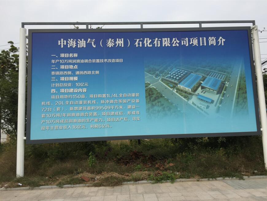 中海油气(泰州)石化有限公司坐落于江苏省泰州市滨江工业园区。该项目为中海油气(泰州)石化有限公司10万吨/年润滑油调合项目的前期临时安防工程,项目占地约150亩。该项目前期安防工程包括出入口管理系统、视频监控系统、室外大屏信息发布系统以及入侵报警系统(张力围栏)。本项目为新建项目,自2017年10月施工,至2018年1月竣工。