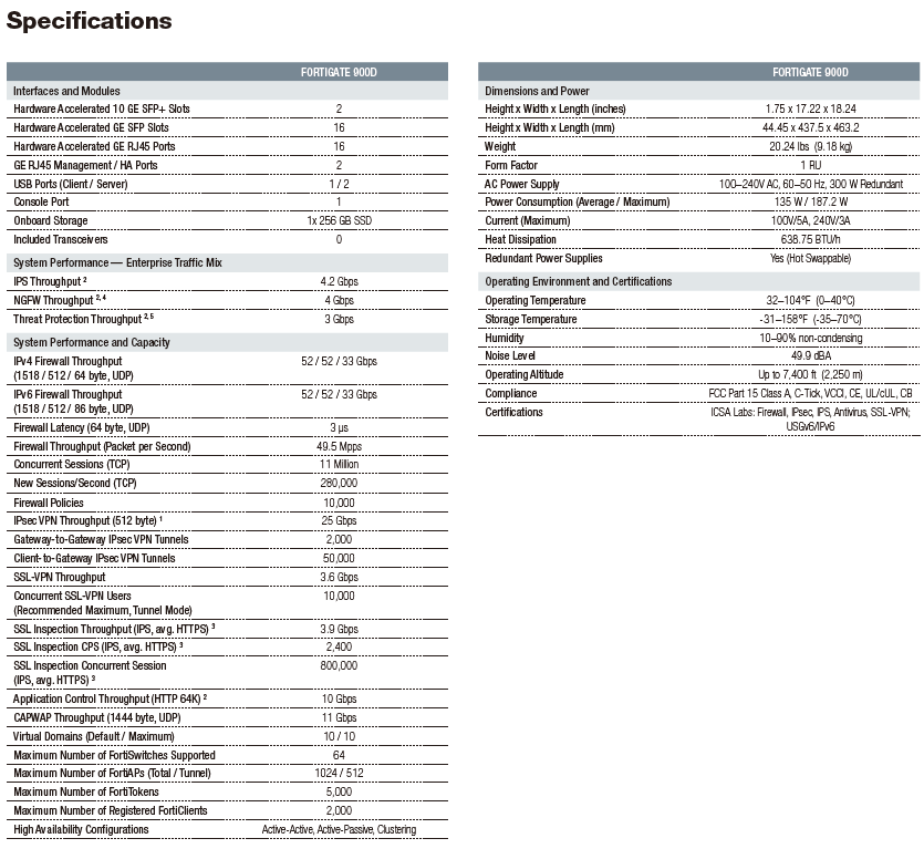 The FortiGate 900D delivers next generation firewall capabilities for mid-sized to large enterprises, with the flexibility to be deployed at the campus or enterprise branch. Protect against cyber threats with security processor powered high performance, security efficacy and deep visibility.
