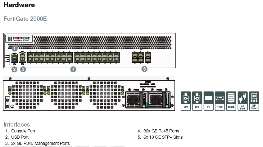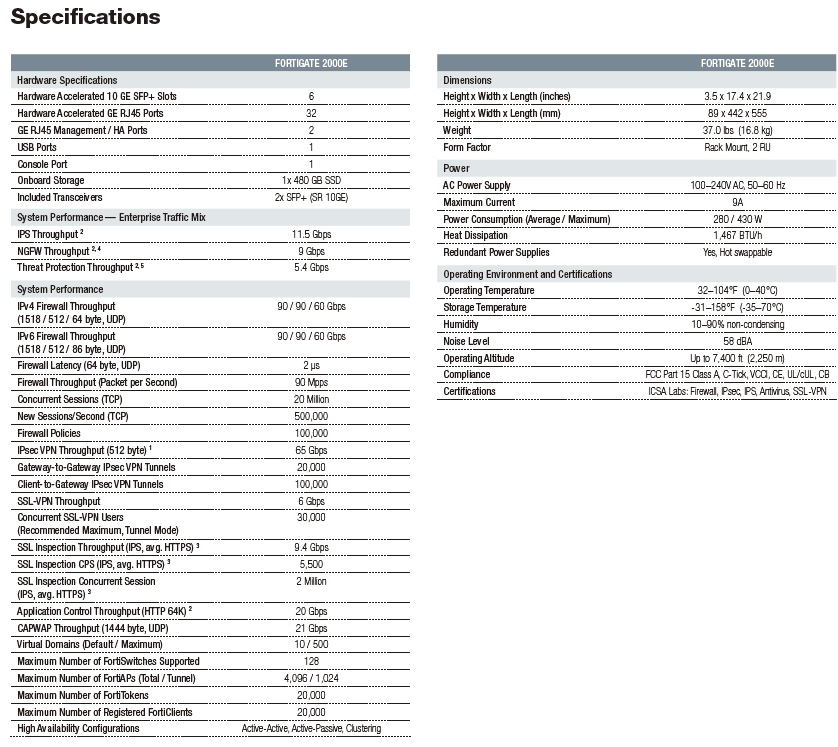The FortiGate 2000E delivers high performance threat protection and SSL inspection for large enterprises and service providers, with the flexibility to be deployed at the enterprise/cloud edge, in the data center core or internal segments. The multiple high-speed interfaces, high port density, superior security efficacy and high throughput of the 2000E keeps your network connected and secure.