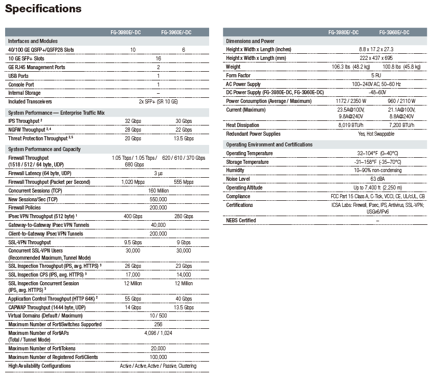 The FortiGate 3900E series delivers high performance threat protection and SSL inspection for large enterprises and service providers, with the flexibility to be deployed at the enterprise/cloud edge, in the data center core or internal segments. The multiple high-speed interfaces, high port density, superior security efficacy and high throughput of the 3900E series keeps your network connected and secure.